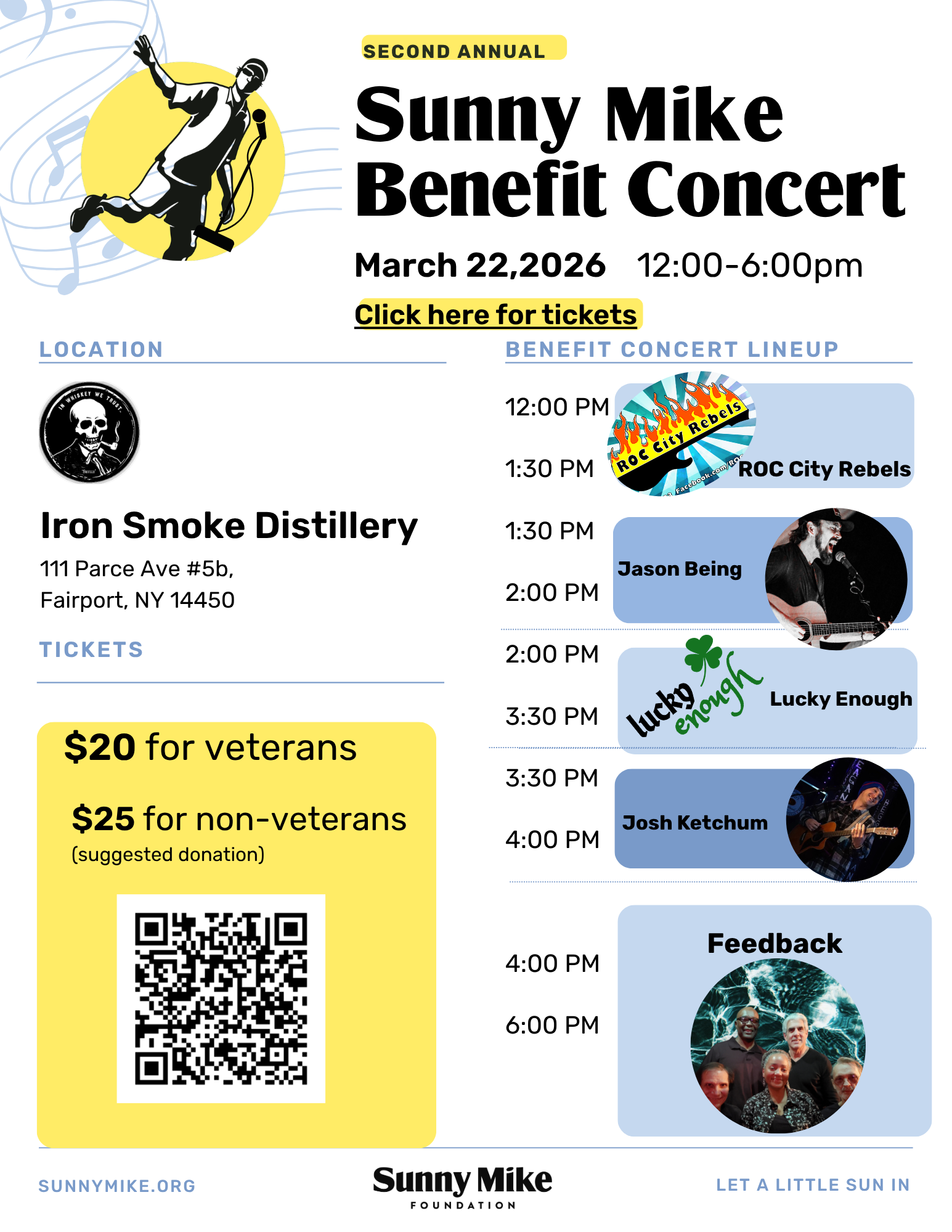 It’s time to let a little sun in again at Sunny Mike’s second annual benefit concert! Proceeds go to the Irvan G. Conrad Emergency Relief Fund to support Air Force, Army, and Coast Guard Veterans facing serious emergencies in the Finger Lakes Region, ensuring that Veterans in need receive the support they deserve. We can’t wait to come together to make a meaningful difference in the lives of local Veterans. Sorry, our food truck canceled at the last minute. But! Several restaurants at the Cannery if you’re hungry!